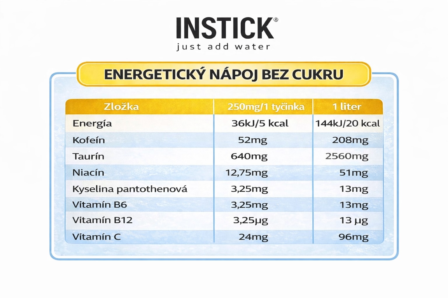 Energetický nápoj v tyčinkách predstavuje moderný energetický koncentrát v prášku, ktorý slúži ako rozpustný energetický nápoj pre fyzickú aj mentálnu výkonnosť. Ide o energy drink bez cukru, vďaka čomu je vhodný pre aktívnych ľudí, športovcov aj tých, ktorí chcú energiu bez cukru a bez zbytočných kalórií.Práškový energetický nápoj v stick balení je praktický, ľahko prenosný a pripravený na použitie kdekoľvek. Stačí voda a máte hotový instantný energetický nápoj, ktorý zároveň podporuje pitný režim.