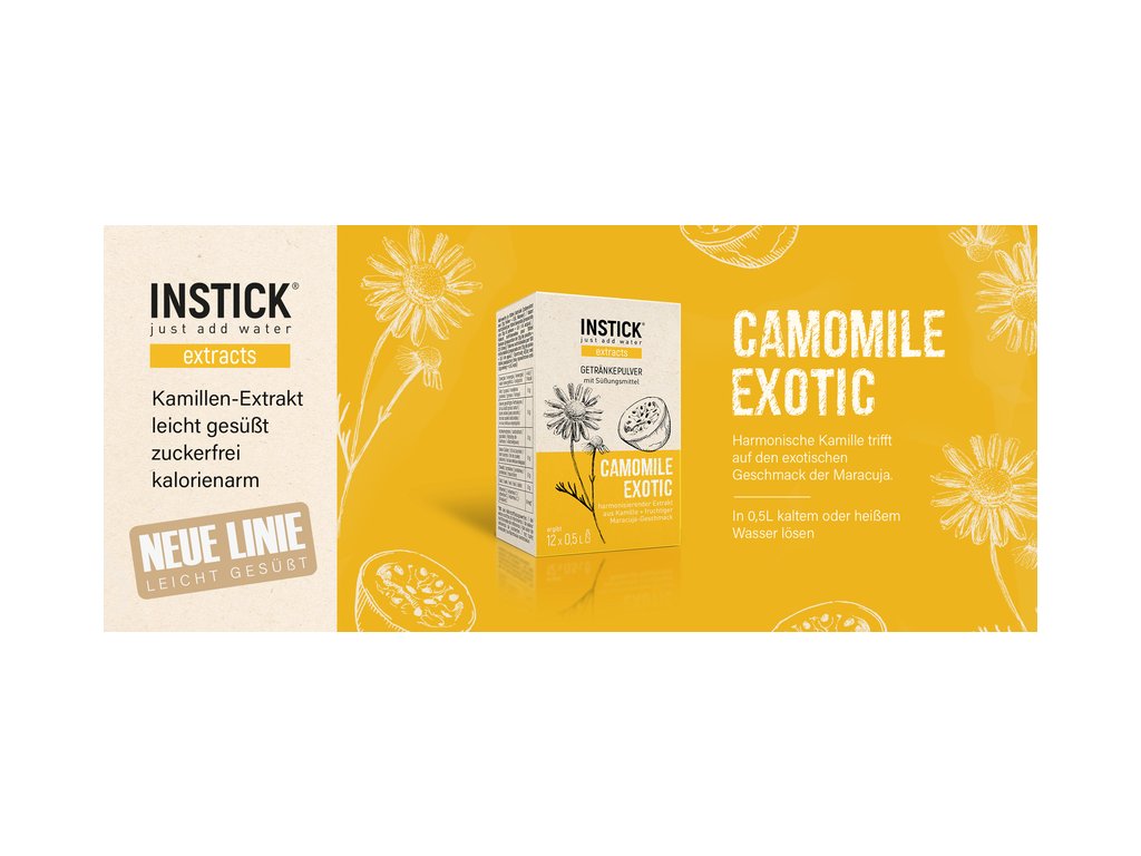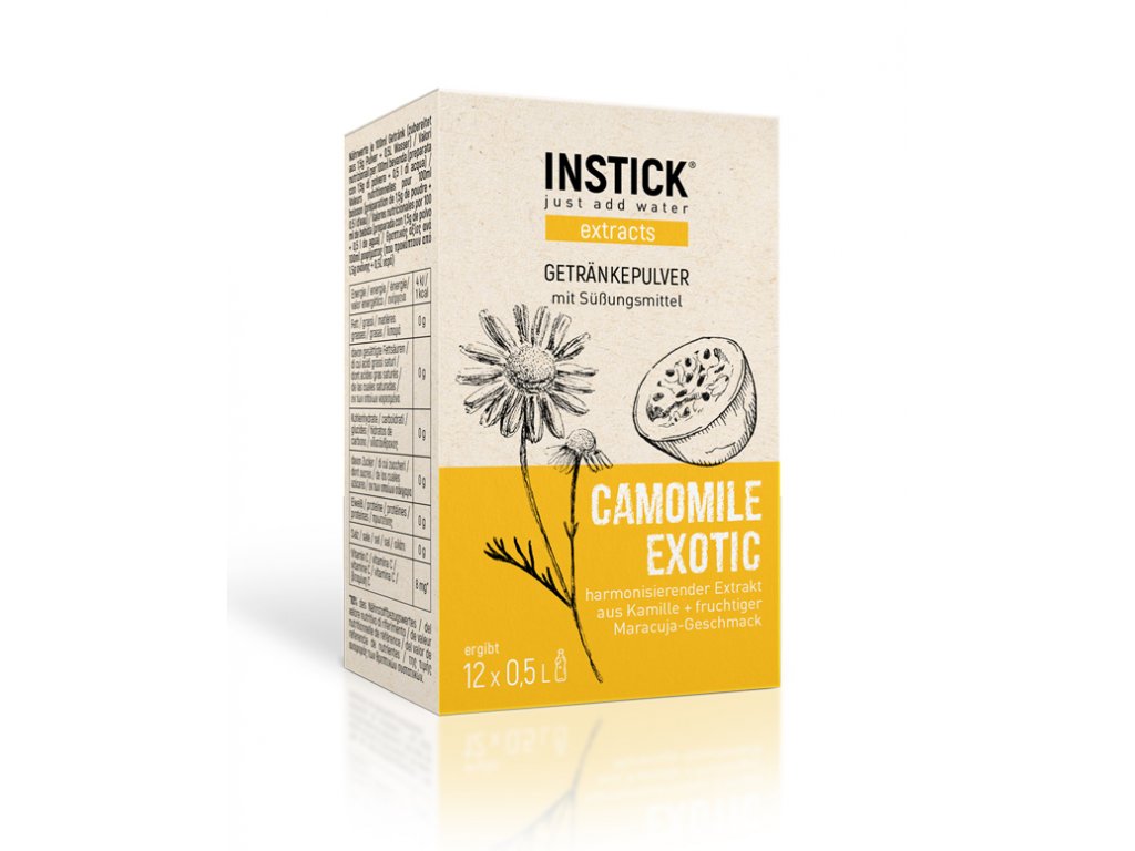- Instantný nápoj v prášku Camomile Exotic je jednou z našich odrôd extraktov. Hotový miešaný nápoj je vegánsky, bez cukru a mierne osladený steviol-glykozidmi z rastliny stévia (sladidlo).
