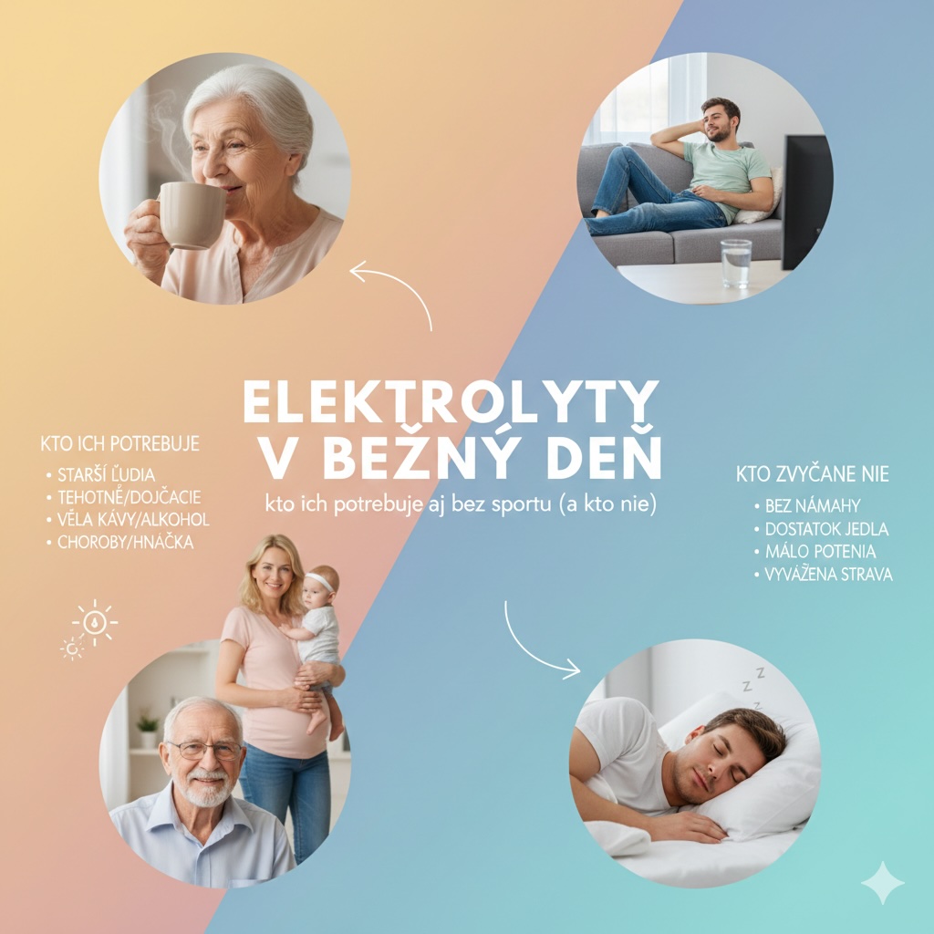 Obrázok: Kedy dávajú elektrolyty najväčší zmysel (bežný deň vs. teplo/šport/cestovanie).